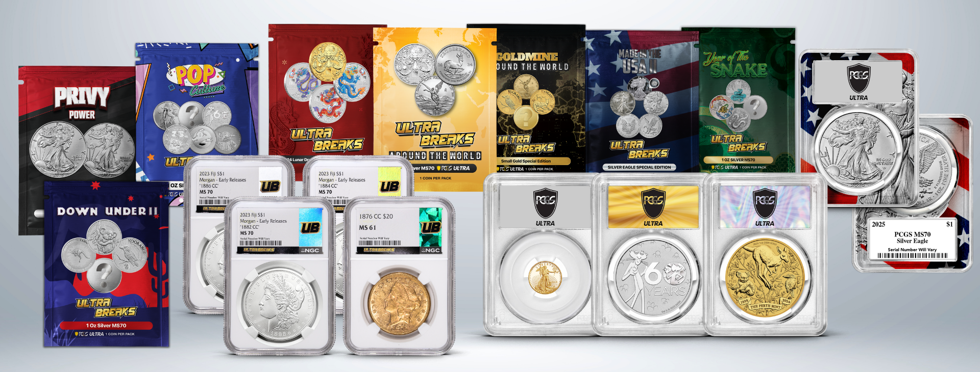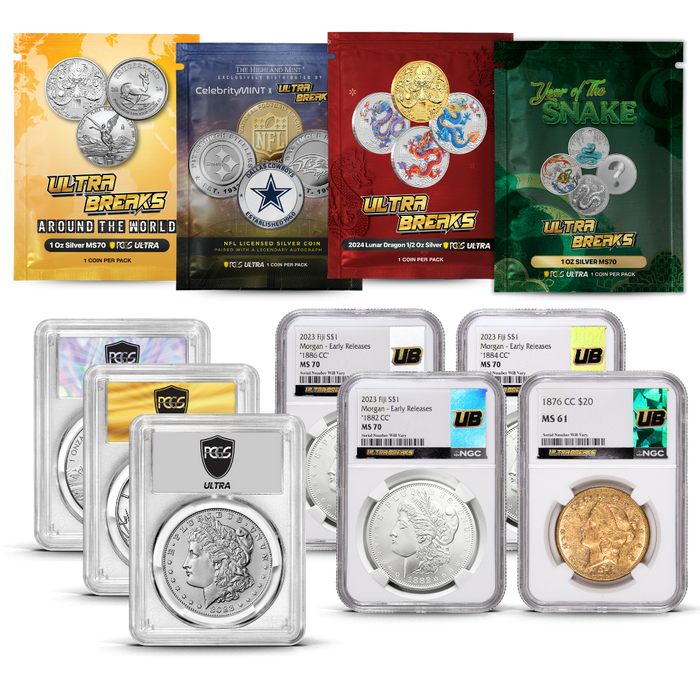 We took the timeless value of certified coins and electrified it with drama, surprise, and style. Each UltraBreaks pack is a mystery box — will you land a standard coin, a stunning Gold Rush label, or the ultra-rare Infinity slab that legends are made from?