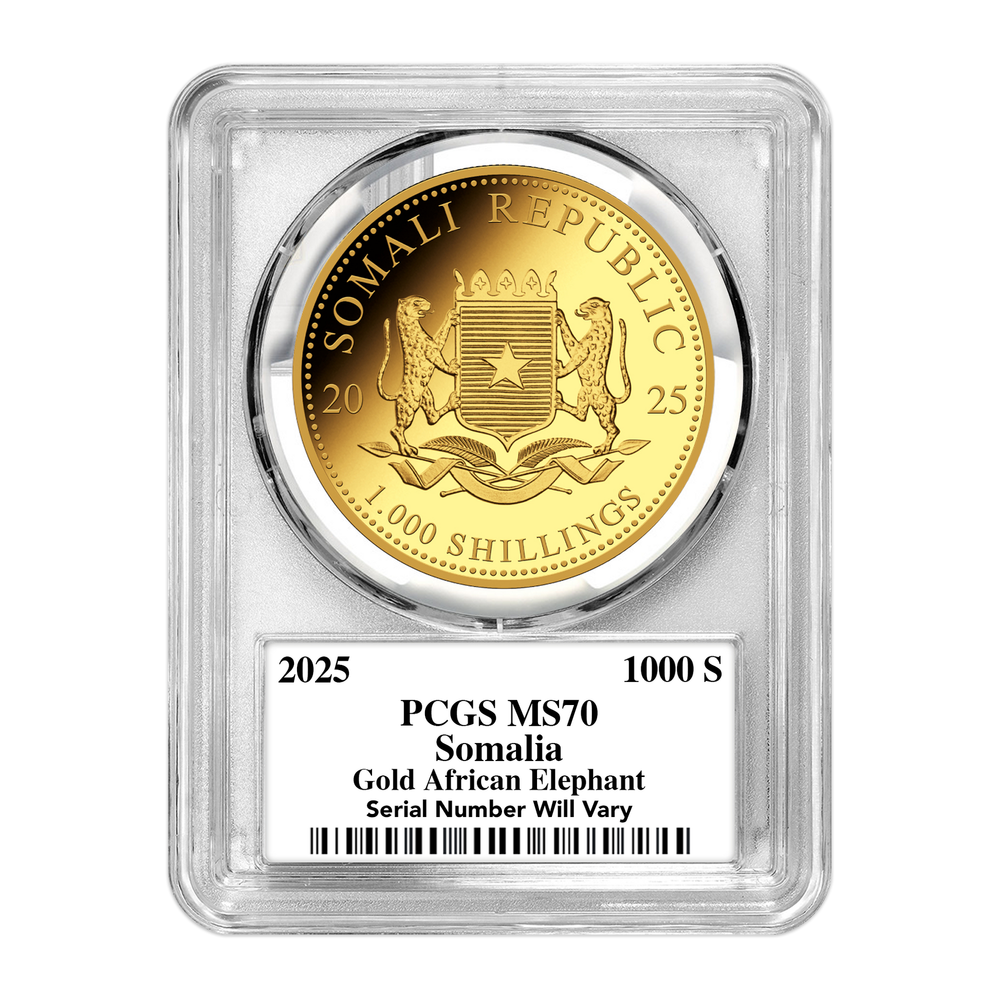 - 4 of the 2025 Somalia Elephant 1 oz gold coins graded MS70 by PCGS (3 Gold Rush labels and just 1 Infinity label)