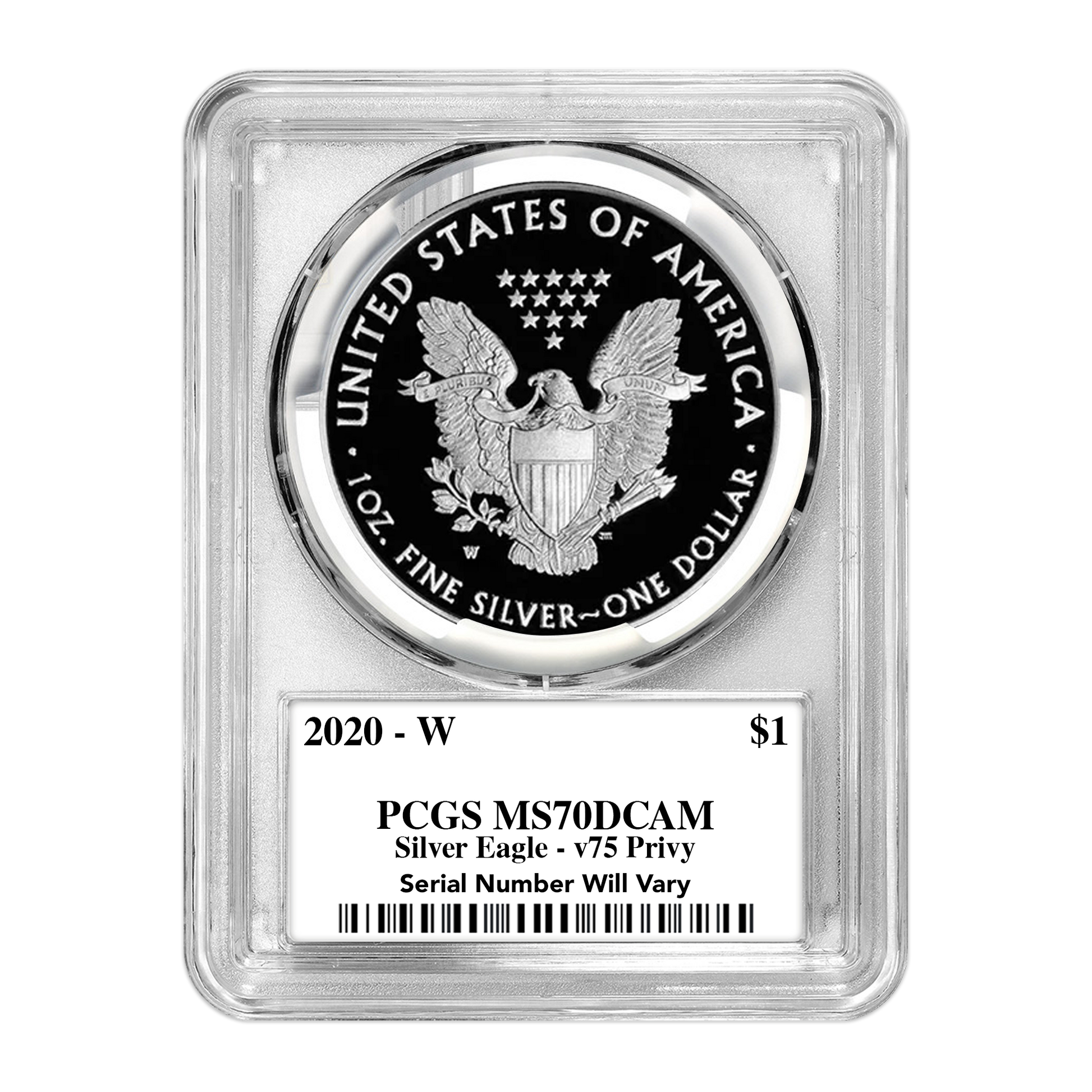 2020 V75 Silver Eagle PR70 PCGS (24 Gold Rush, 1 Infinity labels)