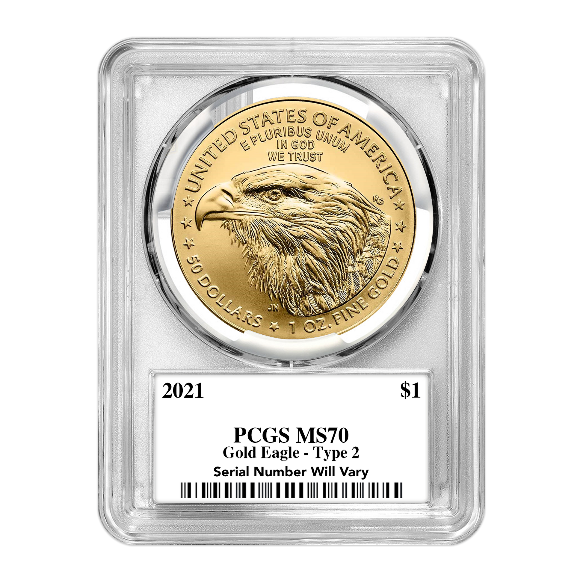 2021 Type 2 1 oz Gold Eagle MS70 PCGS (7 Gold Rush, 1 Infinity labels)