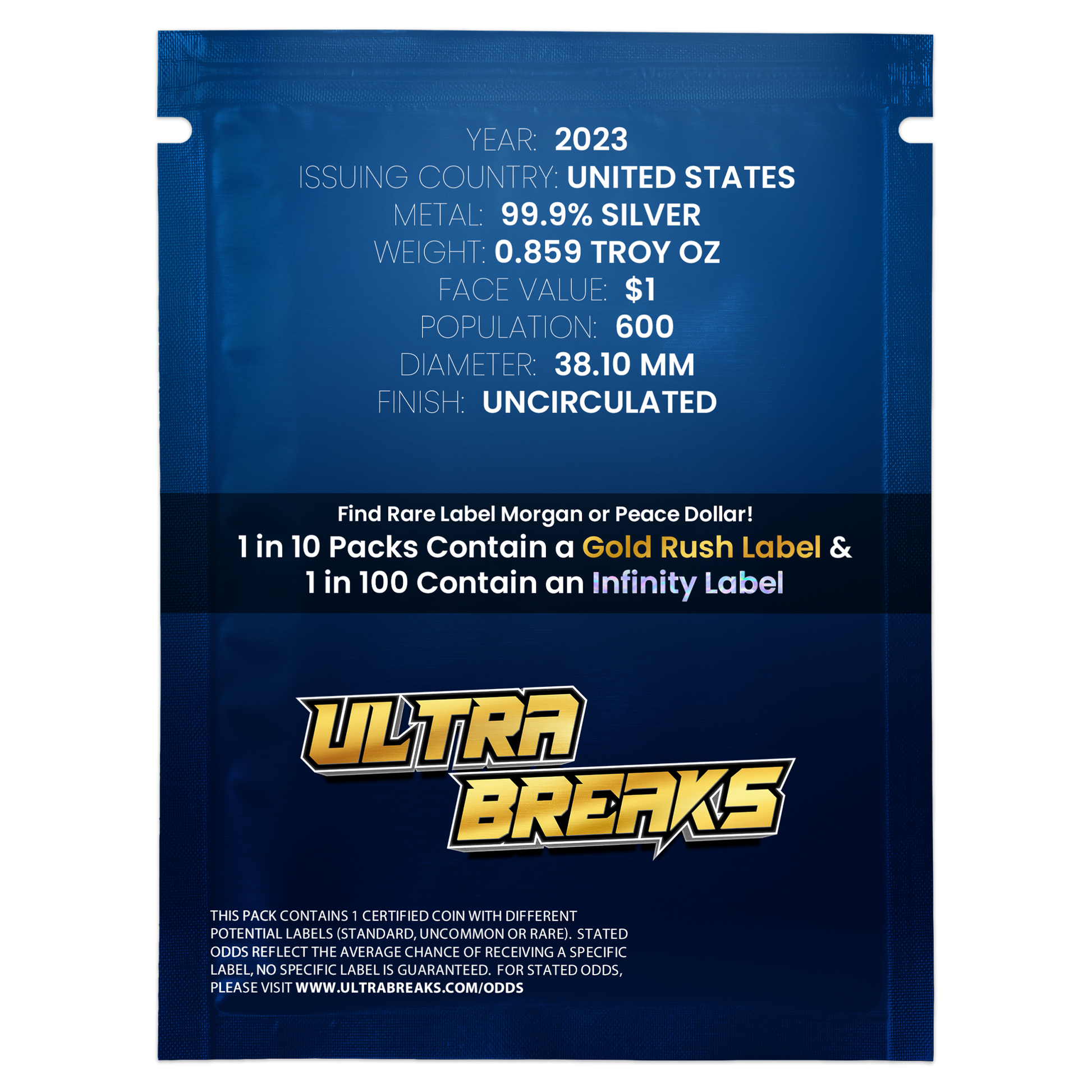 Introducing UltraBreaks - a thrilling new way to collect rare certified coins! Each of the 600 packs contain either a limited edition Ultra 2023 Morgan or Peace Dollar PCGS MS70. Unwrap your pack & take your chance at the rare Ultra Gold Rush or even the ultra rare Infinity Label! With just 3 of each in existence, they are simply the most limited 2023 Morgan and Peace dollars you can collect!