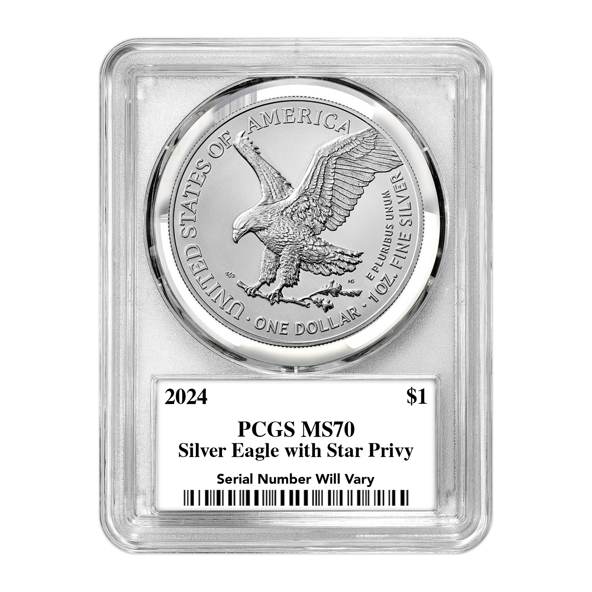 - 1,500 of the 2024 Silver Eagle Star Privy graded MS70 by PCGS (835 Ultra labels, 500 Flag Core Ultra labels, 150 Gold Rush labels, and just 15 Infinity labels)
