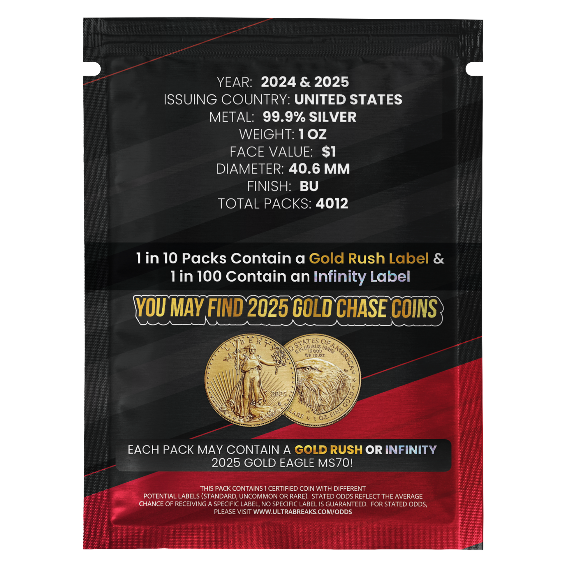 And, of course, 12 lucky collectors will pull a 2025 1oz Gold Eagle out of their packs! This time there will be 9 Gold Rush labels and only 3 Infinity labels amongst the Chase Coins.